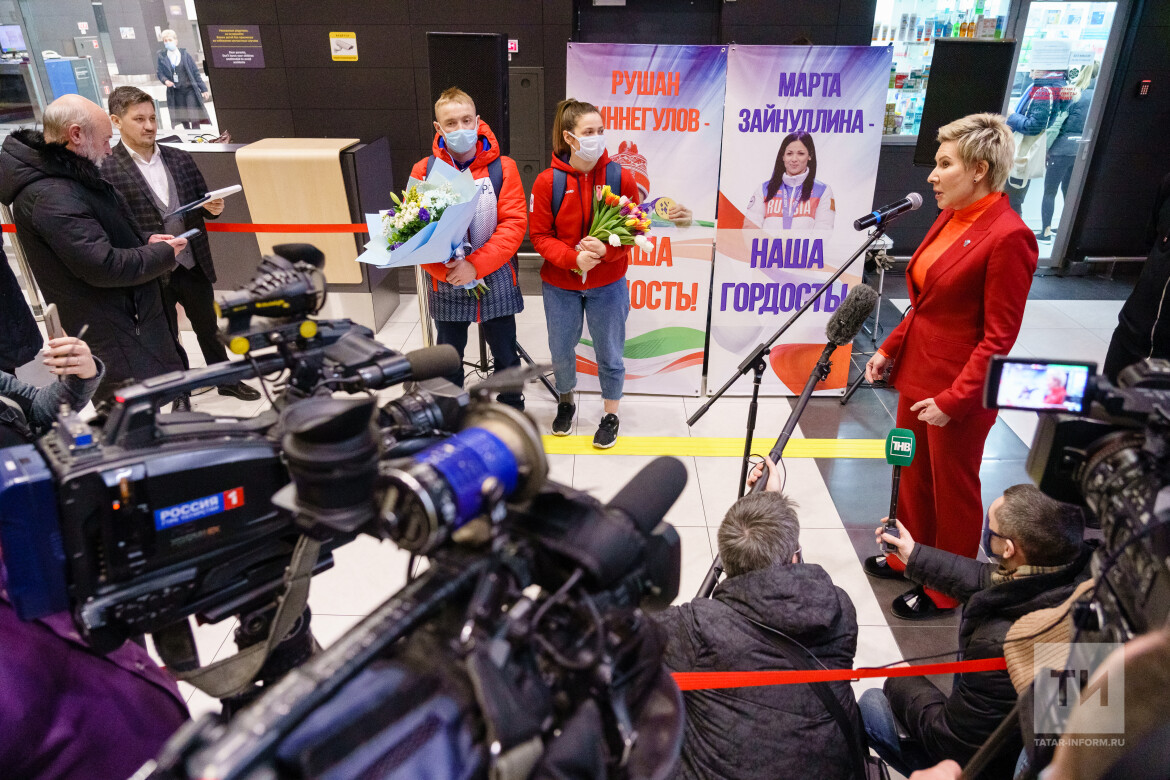 А встречали Рушана и Марту в казанском аэропорту шумно, громко и тепло, с цветами и поздравлениями. Отметим среди встречавших первого тренера Зайнуллиной Ирину Полякову. Заместитель министра спорта РТ Ильдар Садриев прямо назвал спортсменов героями.