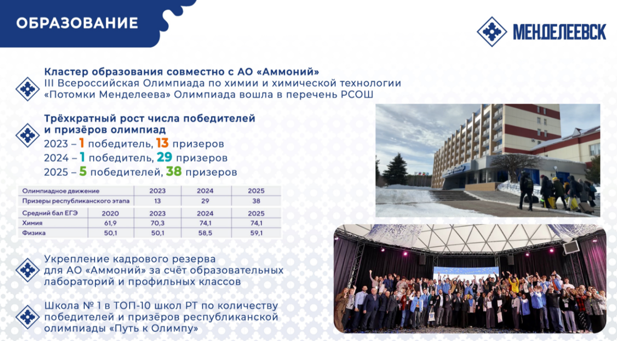 Менделеевск в третий раз примет Всероссийскую олимпиаду «Потомки Менделеева» – подано более 800 заявок. Зафиксирован трехкратный рост числа победителей и призеров олимпиад.