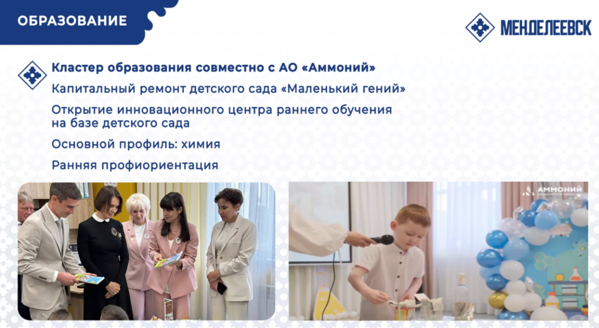 Район делает ставку на подготовку кадров и развитие образовательной среды. Совместно с АО «Аммоний» продолжается развитие кластера «Аргентум». В 2025 году капитально отремонтирован детский сад №12 «Маленький гений», где открыт инновационный центр раннего научного обучения.