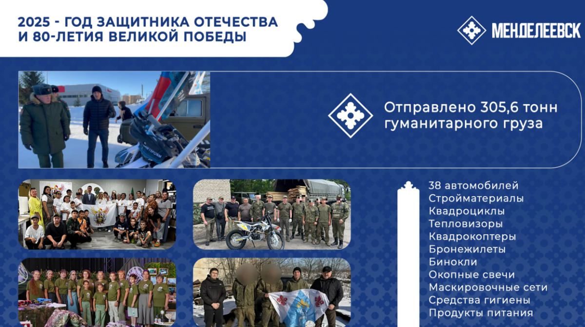С начала СВО из Менделеевска отправлено 305,6 тонны гуманитарного груза, включая 38 автомобилей, 10 мотоциклов, средства РЭБ, тепловизоры, квадрокоптеры и стройматериалы. В районе действуют инициативные группы «Мы вместе», «Тепло из дома» и «Своих не бросаем».