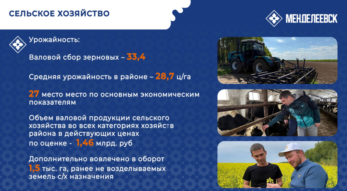 По данным Минсельхозпрода РТ, общая денежная выручка сельхозпредприятий выросла до 1 млрд рублей (102% к 2024 году), в основном за счет животноводства. Однако в расчете на гектар пашни Менделеевский район находится лишь на 40-м месте – 27,2 тыс. рублей.