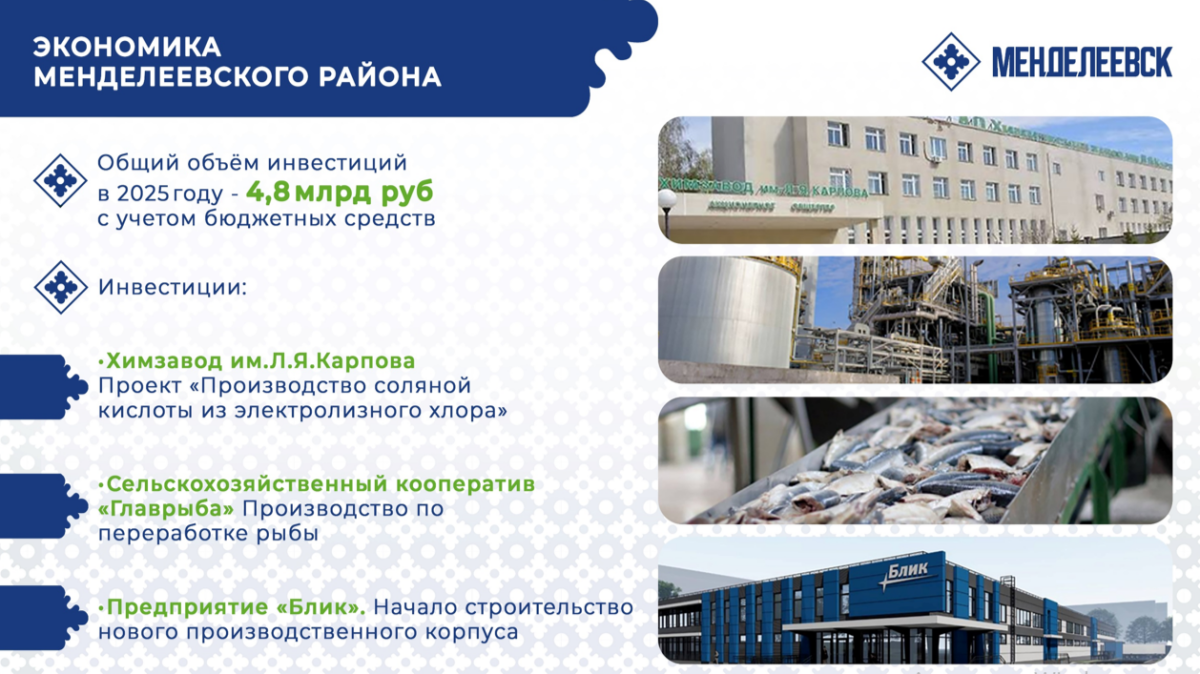 Общий объем инвестиций в 2025 году достиг 4,8 млрд рублей. В числе ключевых проектов – обновление производственных мощностей Химзавода имени Карпова, возведение нового производственного корпуса компанией «Блик», сельхозкооператив «Главрыба» запустил перерабатывающее производство.
