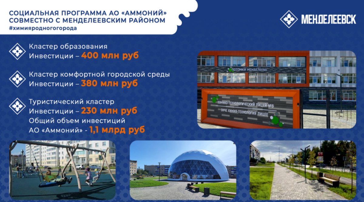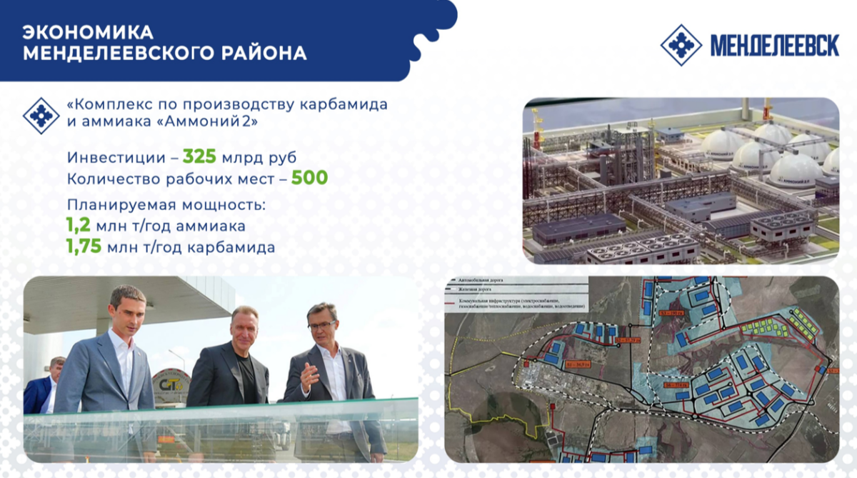 Стратегическим направлением станет проект «Аммоний 2» – комплекс по производству карбамида и аммиака. Объем инвестиций составит 325 млрд рублей, будет создано более 500 рабочих мест. Он станет якорным резидентом площадки особой экономической зоны «Алабуга – Менделеевск».