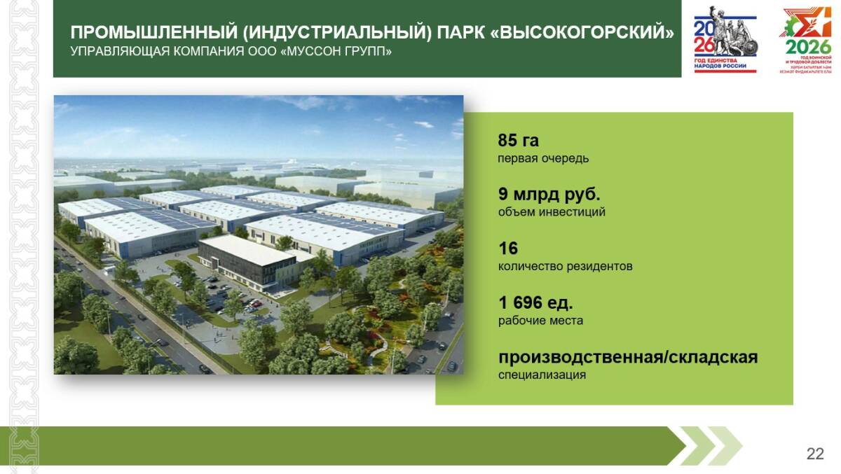 Общий объем инвестиций в Высокогорский район по итогам 2025 года должен достигнуть отметки в 25 млрд рублей. В муниципалитете ожидается реализация нескольких крупных проектов. Один из них – промышленный парк «Высокогорский».