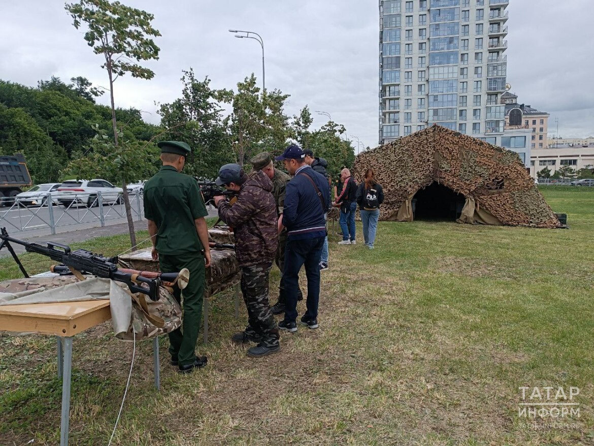 Однако среди красавиц в национальных одеждах гуляли и военные в бронежилетах - это представители палатки от казанского танкового училища. Они развернули здесь выставку оружия и приглашали юношей на обучение в учебное заведение.
