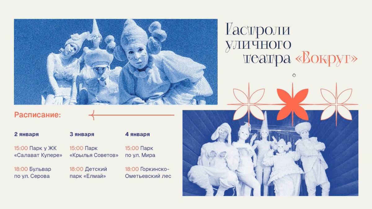 В шести парках города 2, 3 и 4 января пройдут выступления уличного театра из Санкт-Петербурга «Вокруг». Он представит шоу об удивительных и смешных инопланетных астронавтах, прилетевших на Землю на большом космическом корабле.