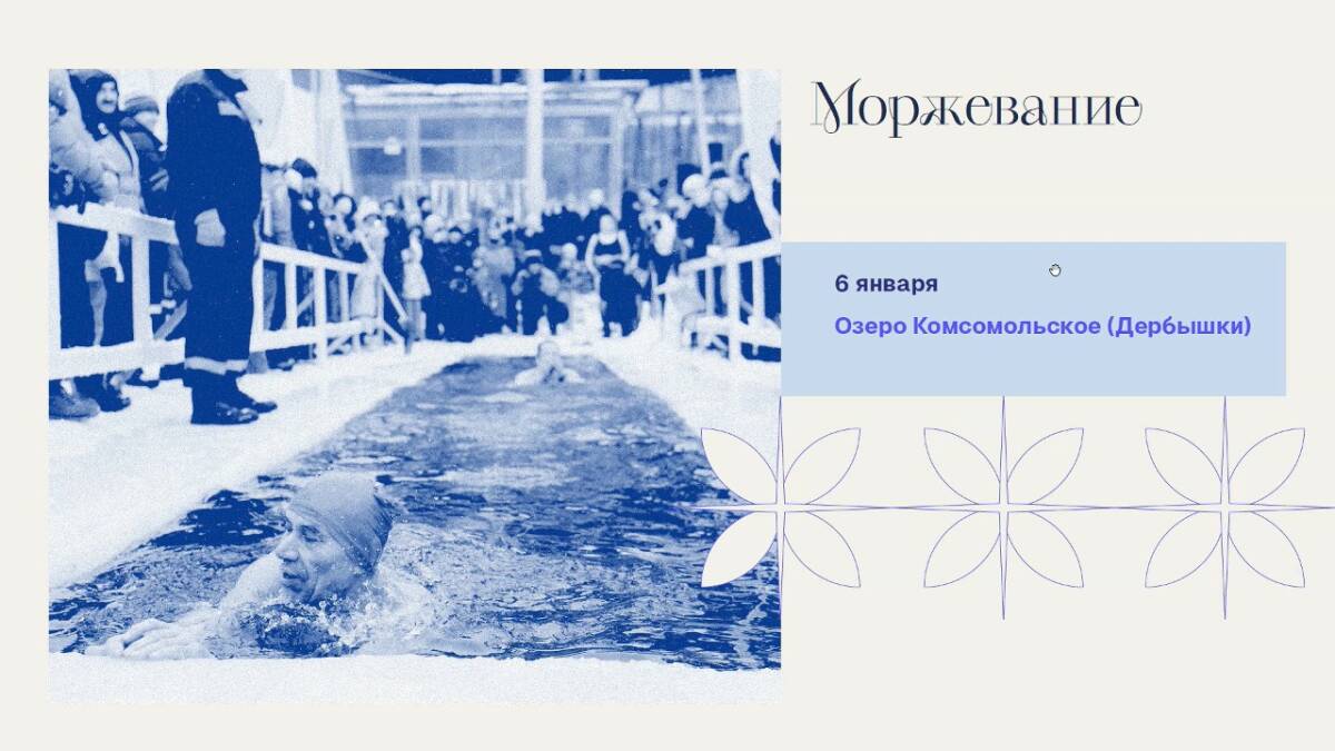 6 января на озере Комсомольское в Дербышках пройдет ежегодный праздник закаливания для местного сообщества моржей. Присоединиться к показательному заплыву участников и согреться в бане-бочке смогут все желающие.