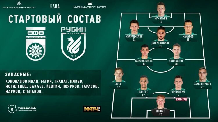 (Казань, 1 июля, «Татар-информ»). Стал известен стартовый состав казанского «Рубина» в матче 25-го тура РПЛ против «Уфы». Игра начнется в столице Башкортостана сегодня, 1 июля, в 15:00 по московскому времени.