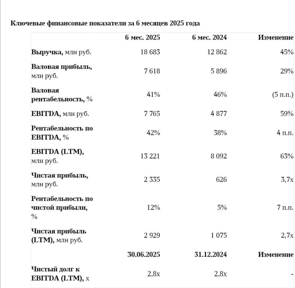 Выручка выросла на 45% год к году и составила 18,7 млрд руб. EBITDA выросла на 59% до 7,8 млрд руб. EBITDA за последние 12 месяцев, завершившихся 30.06.2025 (LTM), составила 13,2 млрд руб. Рентабельность по EBITDA достигла 42%. Чистая прибыль компании выросла в 3,7 раза и составила 2,3 млрд руб. Чистая прибыль за последние 12 месяцев, завершившихся 30.06.2025 (LTM), достигла 2,9 млрд руб. Отношение чистого долга к EBITDA (LTM) сохранилось на уровне 2,8х.