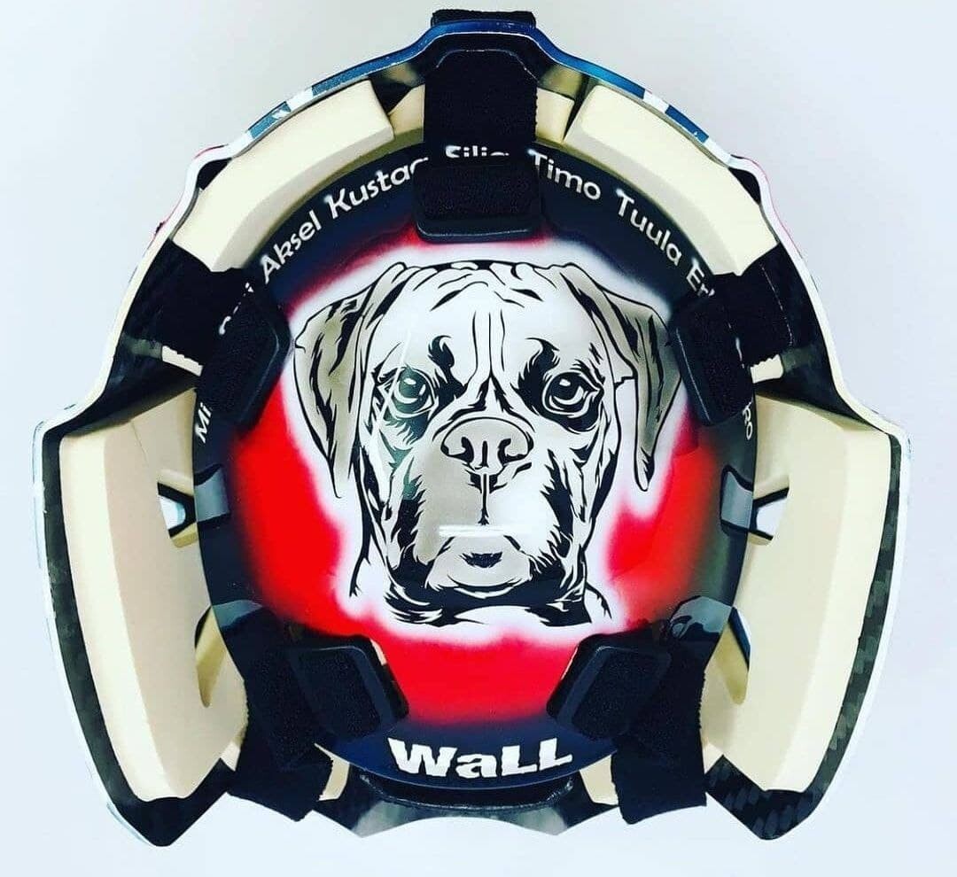 «Сзади изображен мой пес — 8-летний боксер. Я буду очень по нему скучать в течение сезона. Он останется здесь, в Финляндии, с моей невестой. Имена на обороте — мои ближайшие родственники. Моя невеста, мама, папа, братья, бабушка и дедушка. Те, которые живы, и те, которые уже не с нами», — рассказал финский голкипер.