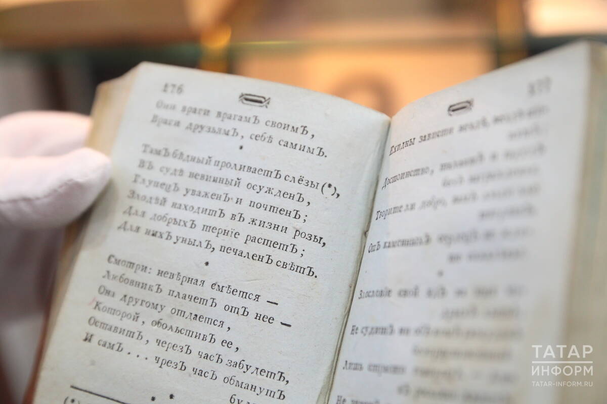 Выставка представляет Карамзина в разных ипостасях – поэт и прозаик (в том числе трэвел-блогер XVIII века), историк, журналист, реформатор русского языка, семьянин, друг. А еще, конечно, рассказывает, что Карамзин «разрешил» официально букве «ё» присутствовать на страницах изданий вместо сочетаний букв «ьо», «iо», «ъо». Экземпляр такой книги (1797 года выпуска!) представлен в витрине. Это альманах «Аониды, или Собрание разных новых стихотворений», обратила внимание собеседница «Татар-информа» – старший научный сотрудник музея Елена Скворцова.