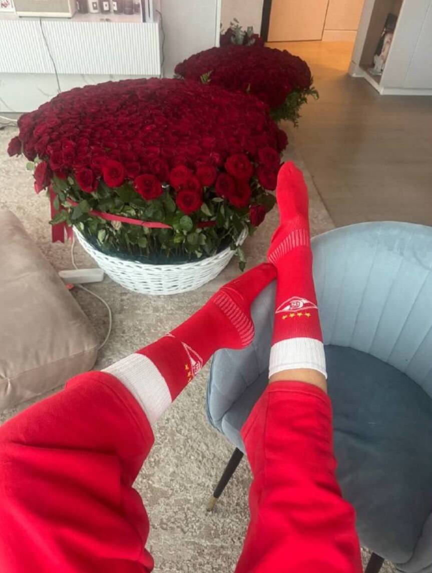 На фото Седокова в красных спартаковских футбольных гетрах. Она сделала фото сверху и захватила две больших корзины с красными розами, оставив соответствующую подпись под постом.
