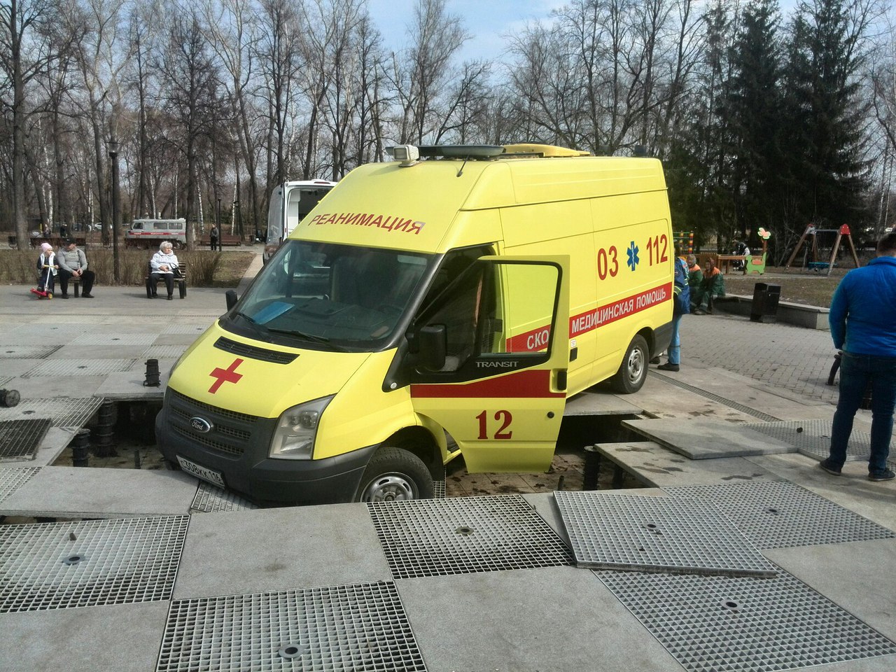 Второй автомобиль с медиками прибыл после того, как первый провалился в фонтан, для того чтобы оказать помощь пожилому человеку.