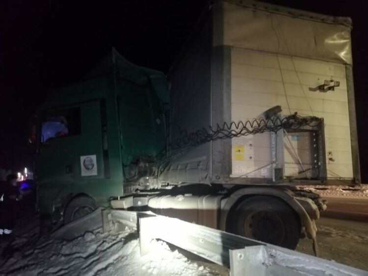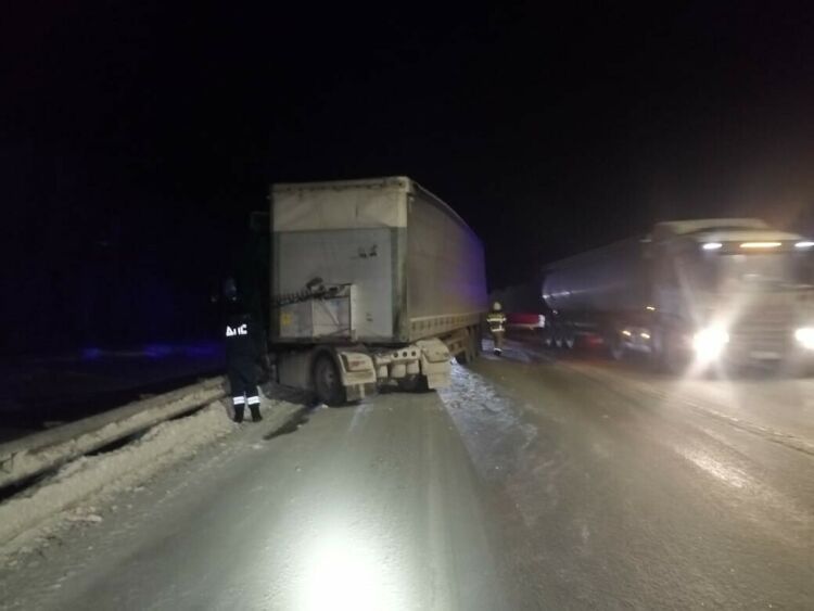 Водитель фуры «МАН» с московскими номерами не удержал большегруз на дороге, его занесло и он снес часть отбойника, а после съехал на обочину.