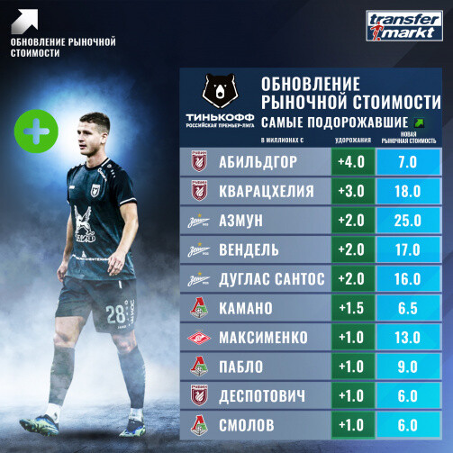 На втором месте по росту цены еще один полузащитник казанского клуба – Хвича Кварацхелия. Футболист сборной Грузии подорожал на 3 млн евро до 18 млн евро. Также в топ-10 игроков с выросшим ценником на начало лета в РПЛ вошел сербский нападающий «Рубина» Джордже Деспотович. Его трансферная стоимость возросла на 1 млн евро и составляет сейчас 7 млн евро.