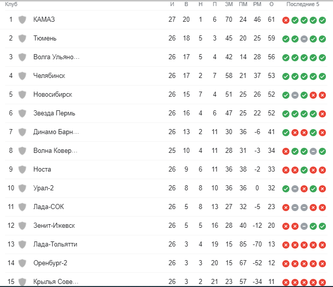 У «Волги», которая разгромила сегодня «КАМАЗ» 56 очков после 26 матчей и теоретически даже они могут финишировать первыми, если татарстанцы и «Тюмень» проиграют оставшиеся матчи в первенстве ПФЛ.