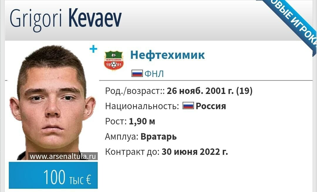 Футбольный клуб «Нефтехимик» объявил о подписании контракта с вратарем Григорием Кеваевым.