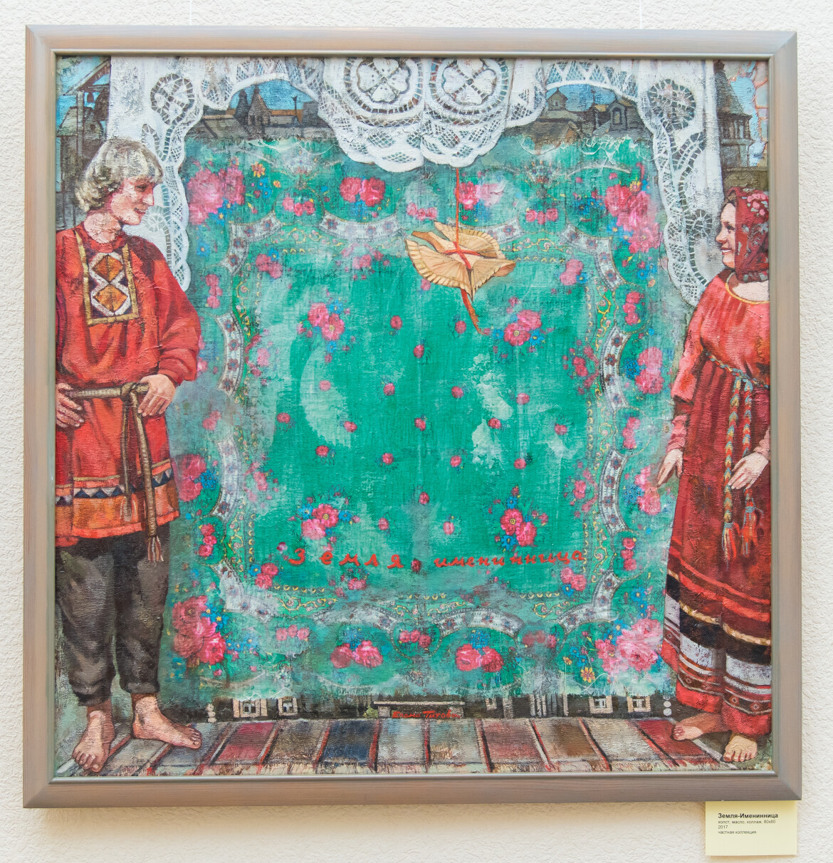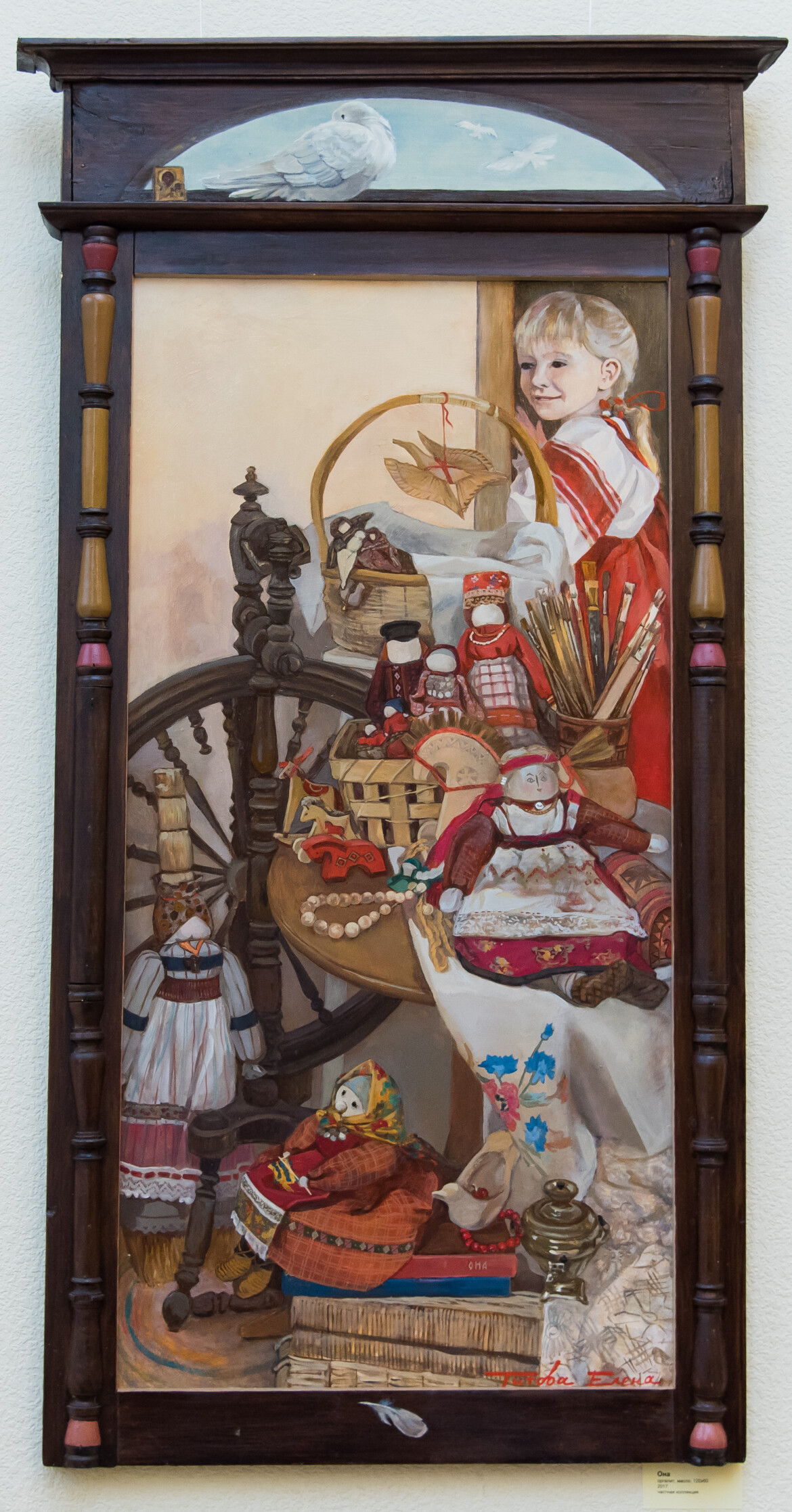 «Эта картина посвящена моей семье, бабушке Наталье Яковлевне. Написана она в этом году, и в апреле уже получила диплом I степени на выставке „Идель-АРТ“. Она же на афише моей персональной выставки „Обереги”. Еще одна знаковая для меня работа, которая будет представлена, — „Возвращение к истокам”. Она несколько меньше, 1,1 на 1,8 метра, а написана была в 2001 году еще в Творческой мастерской живописи Академии художеств. Это будет самая ранняя моя работа из представленных на грядущей выставке», — рассказала «Татар-информу» Елена Титова.
