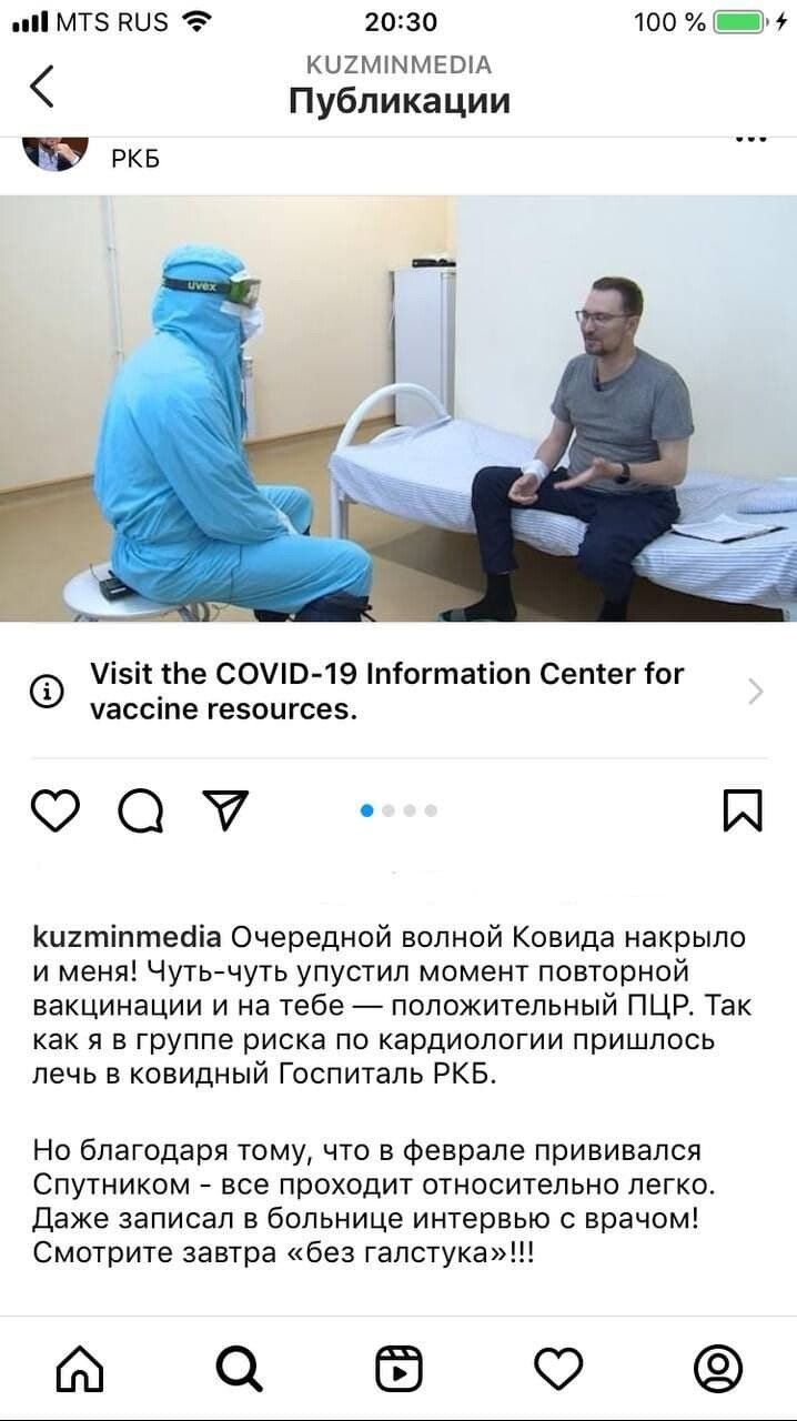 По словам Кузьмина, он находится в группе риска по кардиологии, поэтому принял решение лечь в ковидный госпиталь, расположенный на базе РКБ. Однако благодаря пройденной вакцинации — в начале года он привился «Спутником V» — болезнь протекает легко и без осложнений.