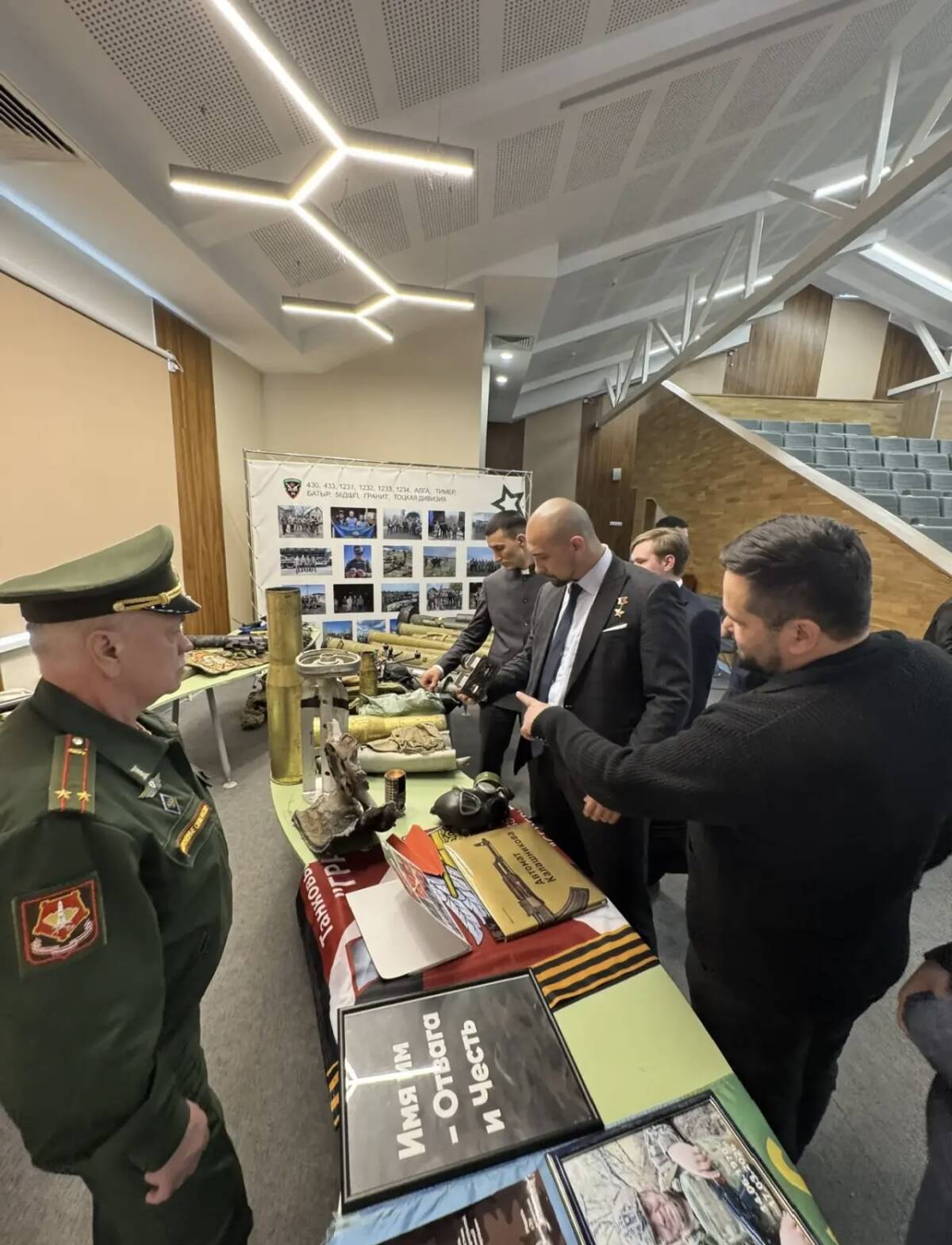 Особую атмосферу придал импровизированный музей, развернутый прямо в зале заседаний. Здесь были представлены находки из зоны СВО, привезенные волонтерами и бойцами: элементы снаряжения, предметы быта и другие свидетельства мужества защитников.