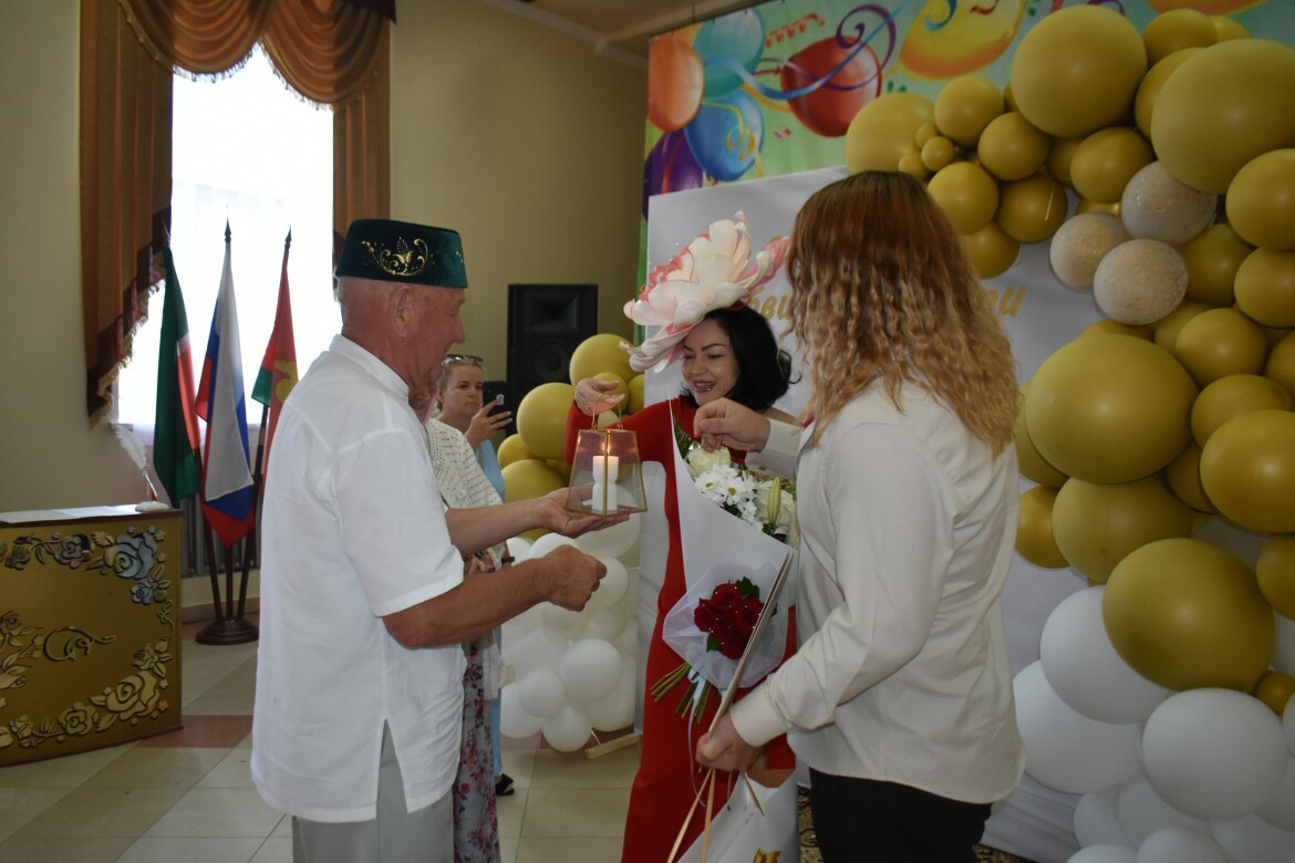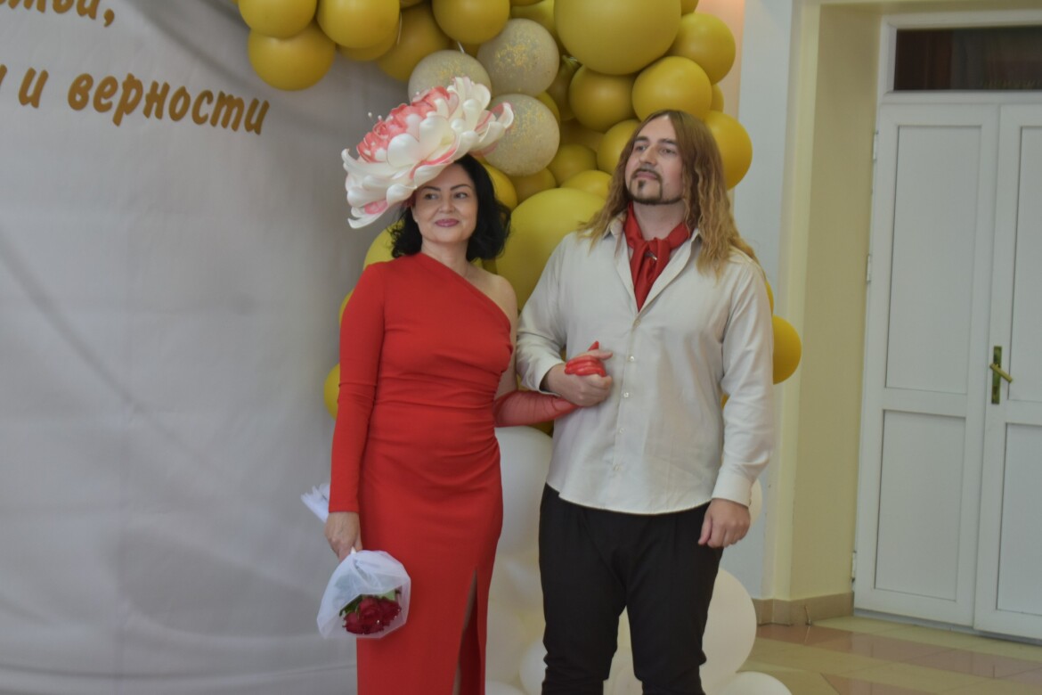Музыкальным номером молодоженов поздравил народный фольклорный ансамбль русской песни «Калинушка», а золотые юбиляры семейной жизни подарили им горящую свечу как символ домашнего очага. Молодожены в свою очередь передали своим свидетелям букет невесты, а району — картину.