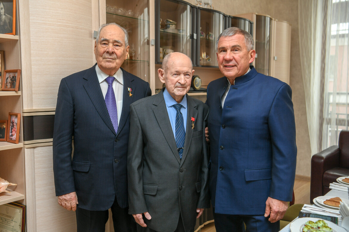 После церемонии Президент РТ Рустам Минниханов и Государственный Советник РТ Минтимер Шаймиев встретились с Героем Социалистического Труда, почетным председателем организации «Герои Татарстана» Ильдусом Мостюковым у него дома.