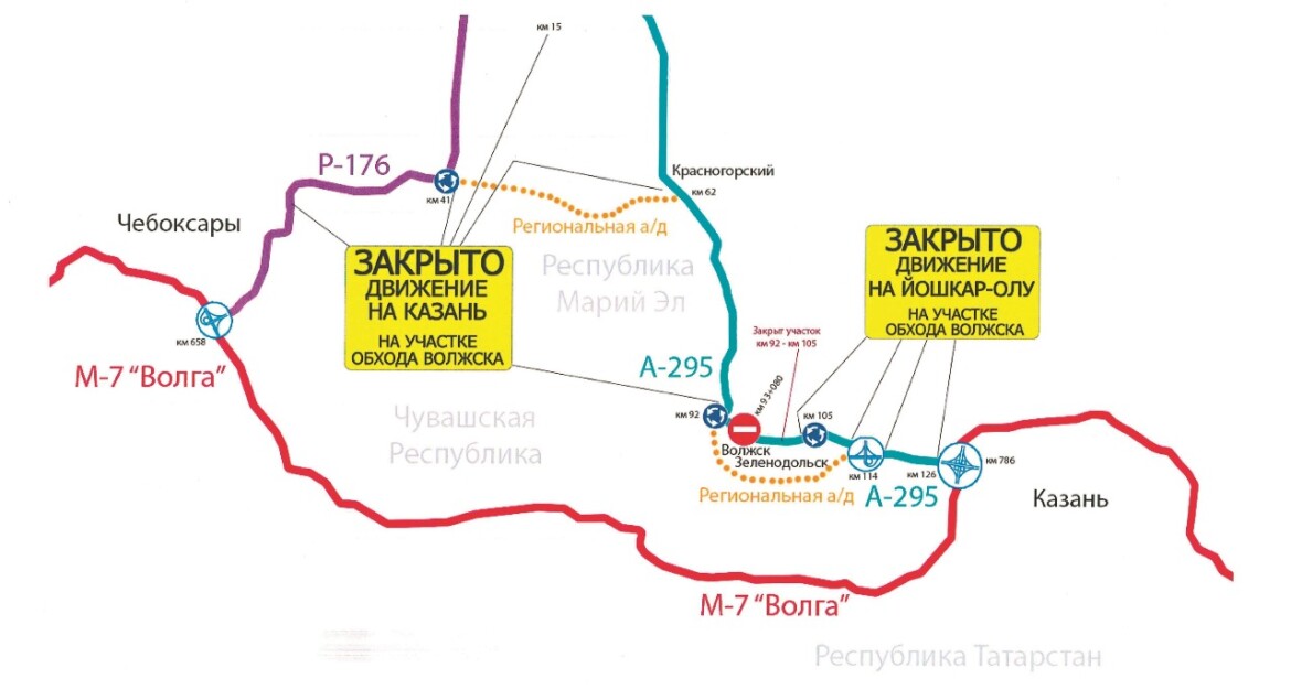 «Одним из вариантов объезда является маршрут через участки федеральных автомобильных дорог М-7 "Волга" (Казань - Цивильск - Кугеси) и Р-176 "Вятка" (Кугеси - Чебоксары - Йошкар-Ола)», – говорится в сообщении Госавтоинспекции.