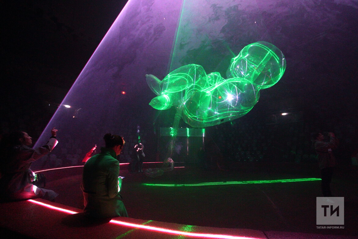 Самой зрелищной стала, конечно, инсталляция в Казанском цирке. Прямо над его ареной и под куполом соавторы Illlluminarium3000 и Luch разместили гигантский прозрачный эмбрион человека с пуповиной и пробегающими по нему то и дело то зелеными, то синими, то красными лучами и искрами света. К завершению инсталляции в ней начинала звучать церковная музыка о рождении сына человеческого.