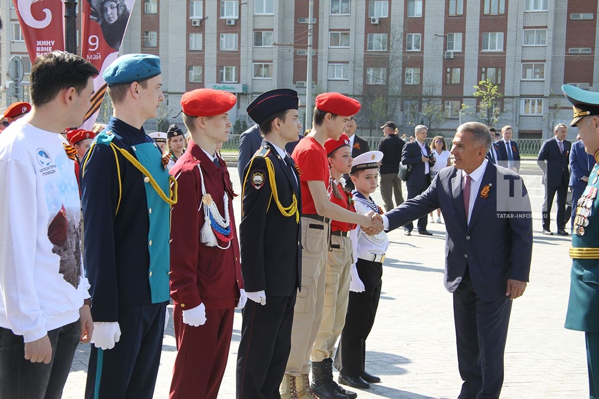 После короткого общения и памятного фотографирования Президент РТ направился из парка на площадь Тысячелетия, где принял торжественный парад по случаю Дня Победы.