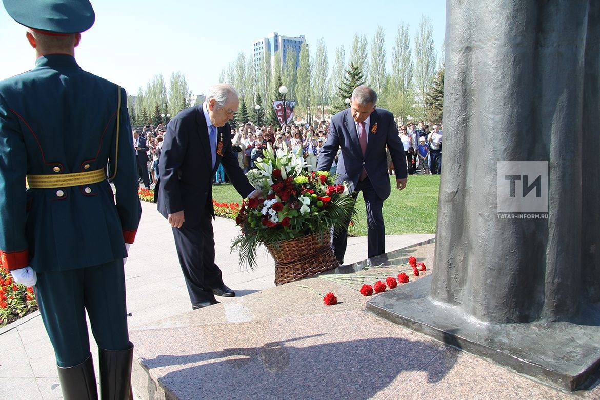 Вместе с ним дань памяти павшим защитникам Отечества отдали Премьер-министр РТ Алексей Песошин, Государственный советник Татарстана Минтимер Шаймиев, мэр Казани Ильсур Метшин, а также татарстанские ветераны Великой Отечественной войны и представители подрастающего поколения – участники молодежных патриотических движений.