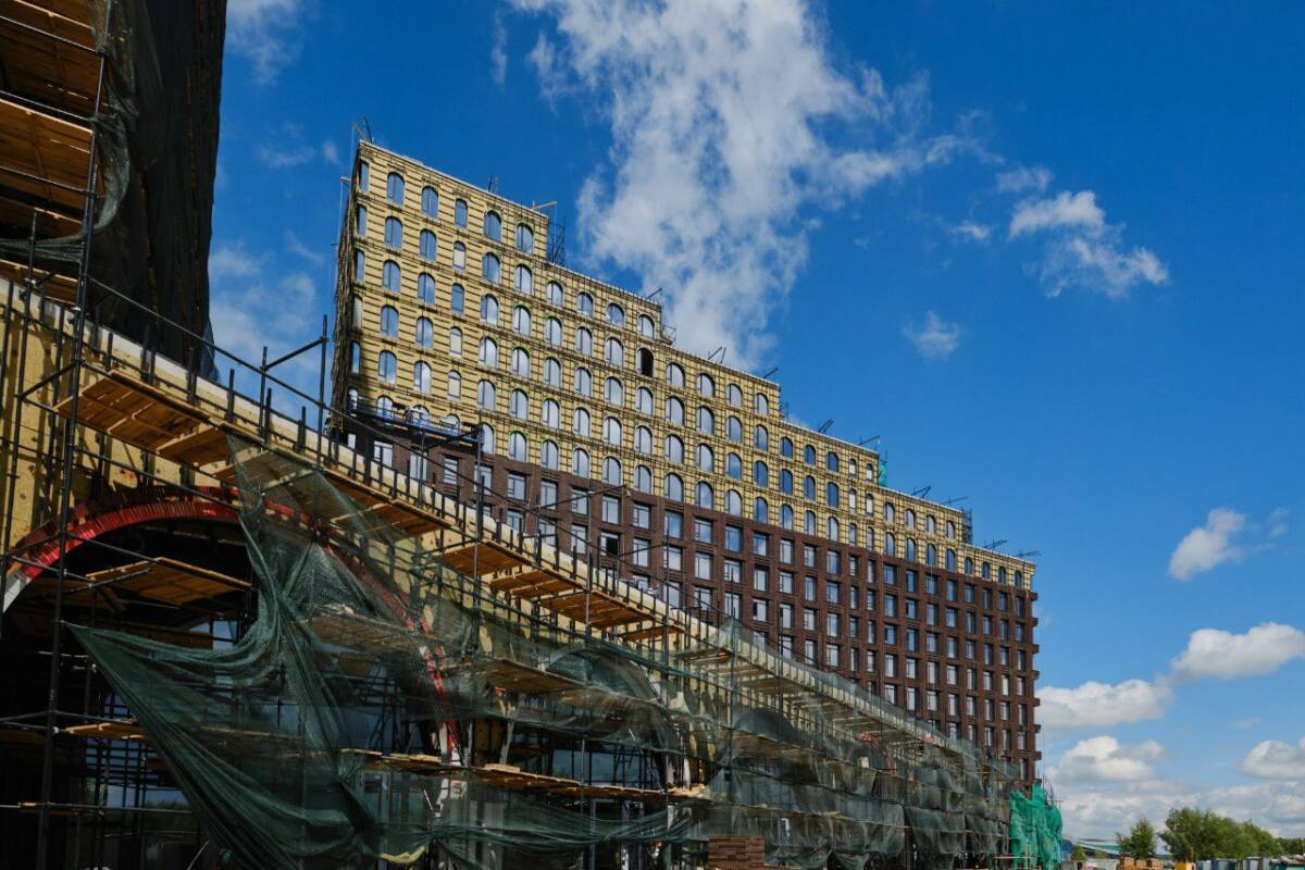 Помимо старта благоустройства, на данном этапе строительства ведутся работы по облицовке из клинкерного кирпича фасадов первой секции комплекса. В этой секции рабочие выполняют каменную кладку под монтаж пожарных шкафов и оштукатуривают стены в холлах лестничных пролетов и гранд-лобби, а также монтируют перегородки на первом этаже и прокладывают слаботочные сети.