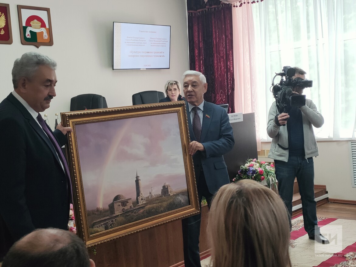 Черкесов поблагодарил Мухаметшина за приглашение и гостеприимство и подарил ему вышитую карту с 85 регионами России. Тот в свою очередь вручил чувашскому коллеге подарок по случаю 1100-летия принятия ислама Волжской Болгарией — картину с изображением мечети.