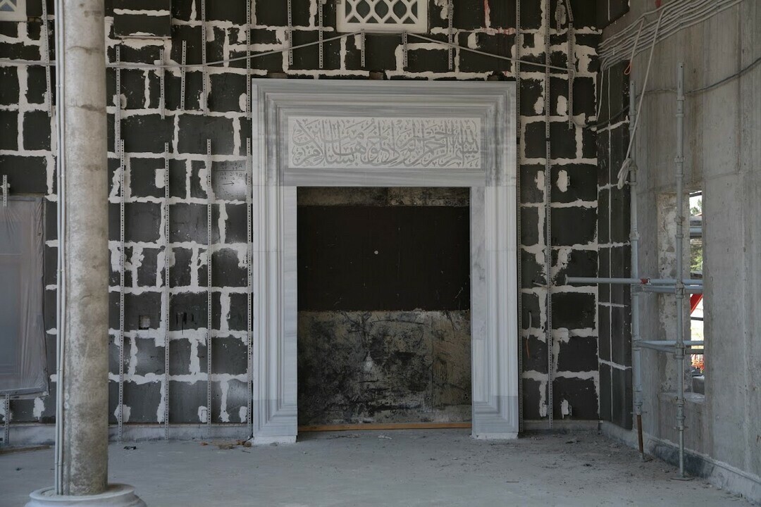 Далее мы увидели мраморный каркас того, что вскоре станет минбаром. Он будет полностью состоять из мраморных элементов индивидуального изготовления. Сегодня готова лишь малая часть минбара. Слева от него традиционно находится михраб – ниша в стене, которая указывает направление на Мекку. Он уже готов и представляет собой массивную мраморную конструкцию.