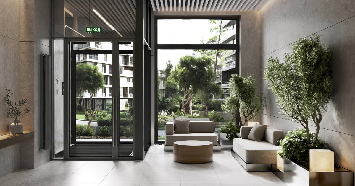 Основными цветами оформления лобби выбраны платиново-серый и бежевый — эти благородные цвета вне времени станут отличным фоном для предметов декора. Оживит интерьер зелень многолетних растений – элемент, который не просто придает уюта, а отсылает к природному окружению локации проекта. В темное время суток растения будут подсвечиваться встроенными в кашпо светильниками в форме куба. Напольное покрытие в лобби выполнено из крупноформатного керамогранита под мрамор с полупрозрачными прожилками. Благодаря высоким потолкам, панорамным окнам и светлой палитре все детали интерьера создают ощущение легкости.