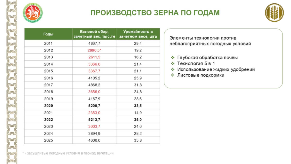 Несмотря на дождливую погоду, которая осложнила уборочную кампанию, в республике собрали 4,6 млн тонн зерна. Это сильный результат на фоне прошлых засушливых лет, когда урожай падал до 2,3–2,6 млн тонн.