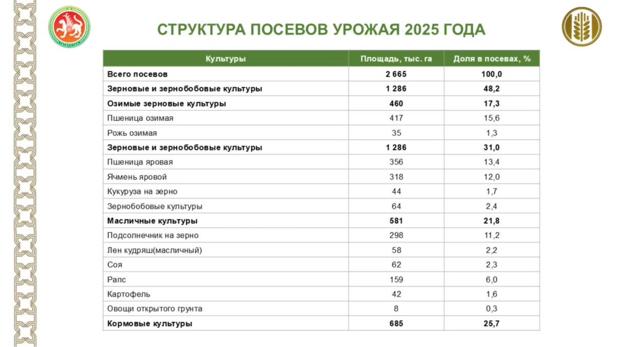 В общей сложности площадь посевов зерновых культур уменьшилась практически на 100 тыс. га. При этом продовольственная безопасность республики обеспечена: внутренняя потребность в 2,5 млн тонн зерна покрывается даже в неблагоприятные годы.
