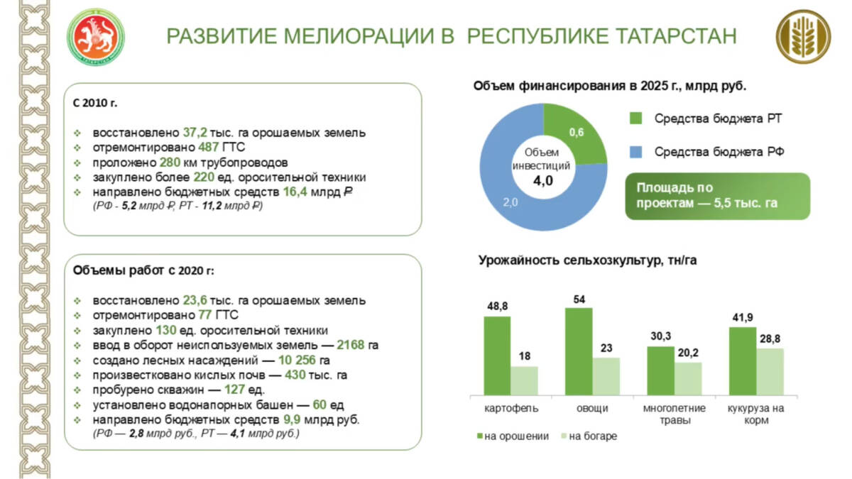 Среди ключевых технологических новаций он выделил глубокое рыхление почвы, применение комбинированных агрегатов «пять в одном», жидкие удобрения с высокой усвояемостью и листовые подкормки. Активно, хотя и недостаточными темпами, развивается мелиорация. Сейчас в республике под орошением находится 37 тыс. га.