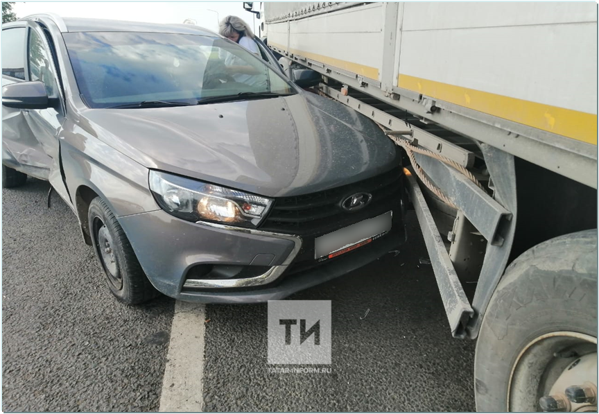 На трассе в РТ два авто столкнулись на перекрестке, одно из них откинуло на грузовик
