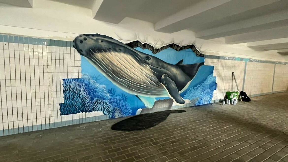 В Набережных Челнах работы по благоустройству завершились не только во дворах, но и в одном из подземных переходов. В переходе на остановке «Океан» на стене нарисованы кит и черепаха. А сегодня художник Марат Билялов пополнил компанию морских обитателей рыбкой марлином.