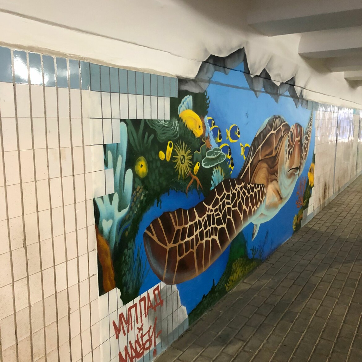 «Подземка на остановке „Океан“. Решили сделать обитателей океана, скажем так, морей. Дельфин и акула слишком попсово, пошли по пути такому. Картинки — ну, просто брали красивые и рисовали», — рассказал о творческом процессе Марат Билялов.