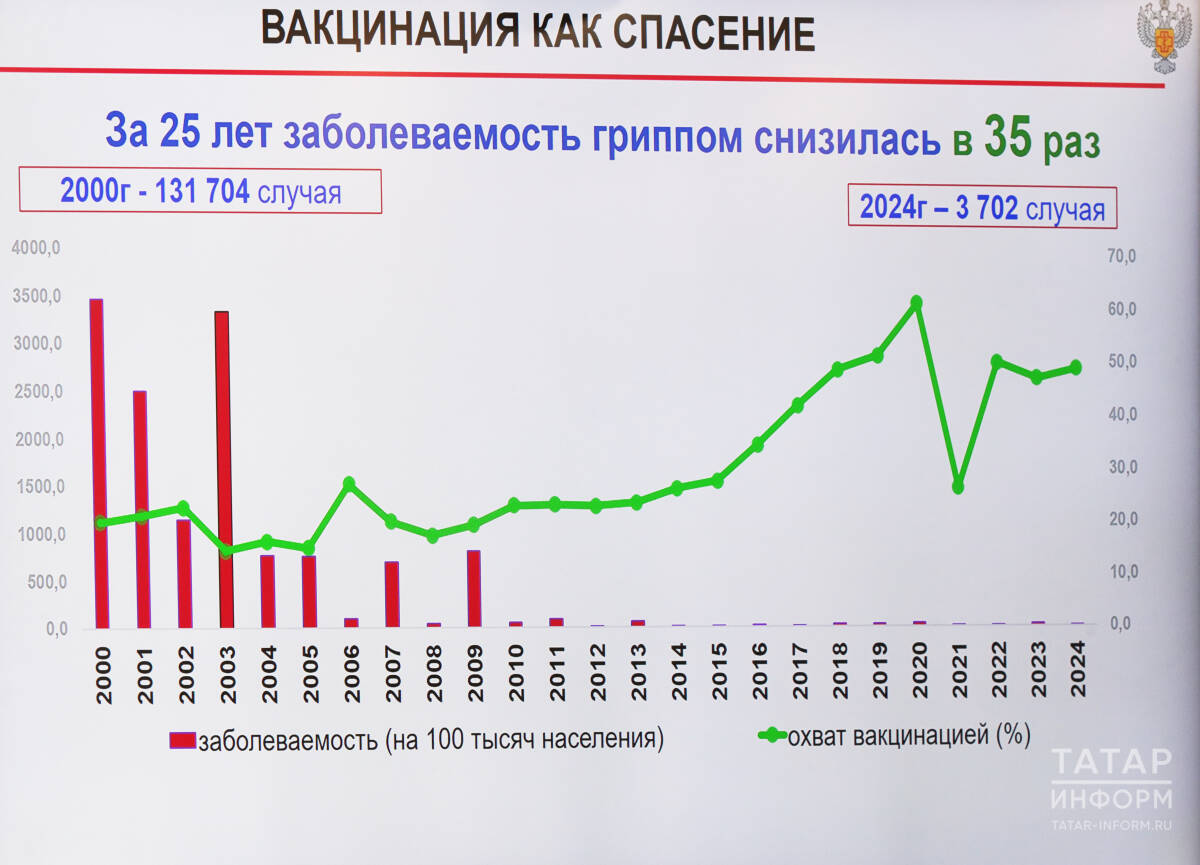Главный санитарный врач РТ отметила: с 2000 года заболеваемость гриппом среди татарстанцев снизилась на 35%. С начала нового учебного года в Татарстане было зафиксировано 8436 случаев гриппа и ОРВИ – это выше уровня последней недели августа на 16,4% и ниже эпидемического порога на 6,3%. Заболеваемость пока низкая, констатируют специалисты, но темпы вакцинации – важнейшего способа защиты населения – снижать никак нельзя.