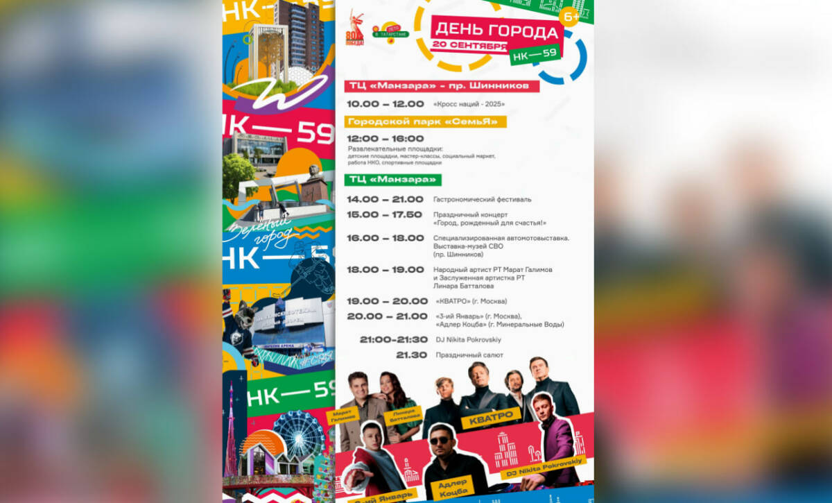 20 сентября главными хедлайнерами Дня города в Нижнекамске станут московская вокальная группа «Кватро», исполнитель Адлер Коцба, певец «3-й Январь», народный артист Татарстана Марат Галимов, заслуженная артистка Татарстана Линара Батталова и DJ Nikita Pokrovskiy.