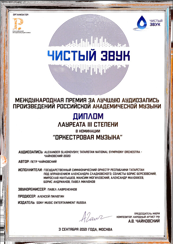 Запись симфонической музыки Петра Чайковского Госоркестра РТ под управлением художественного руководителя и главного дирижера, народного артиста России и Татарстана, профессора Александра Сладковского была высоко оценена на II Международной премии за лучшую аудиозапись произведений российской академической музыки «Чистый звук». Бокс-сет из 10 дисков, выпущенный татарстанским коллективом в 2020 году, был удостоен лауреатства III степени в номинации «Оркестровая музыка». Об этом ИА «Татар-информ» сообщили в пресс-службе оркестра.