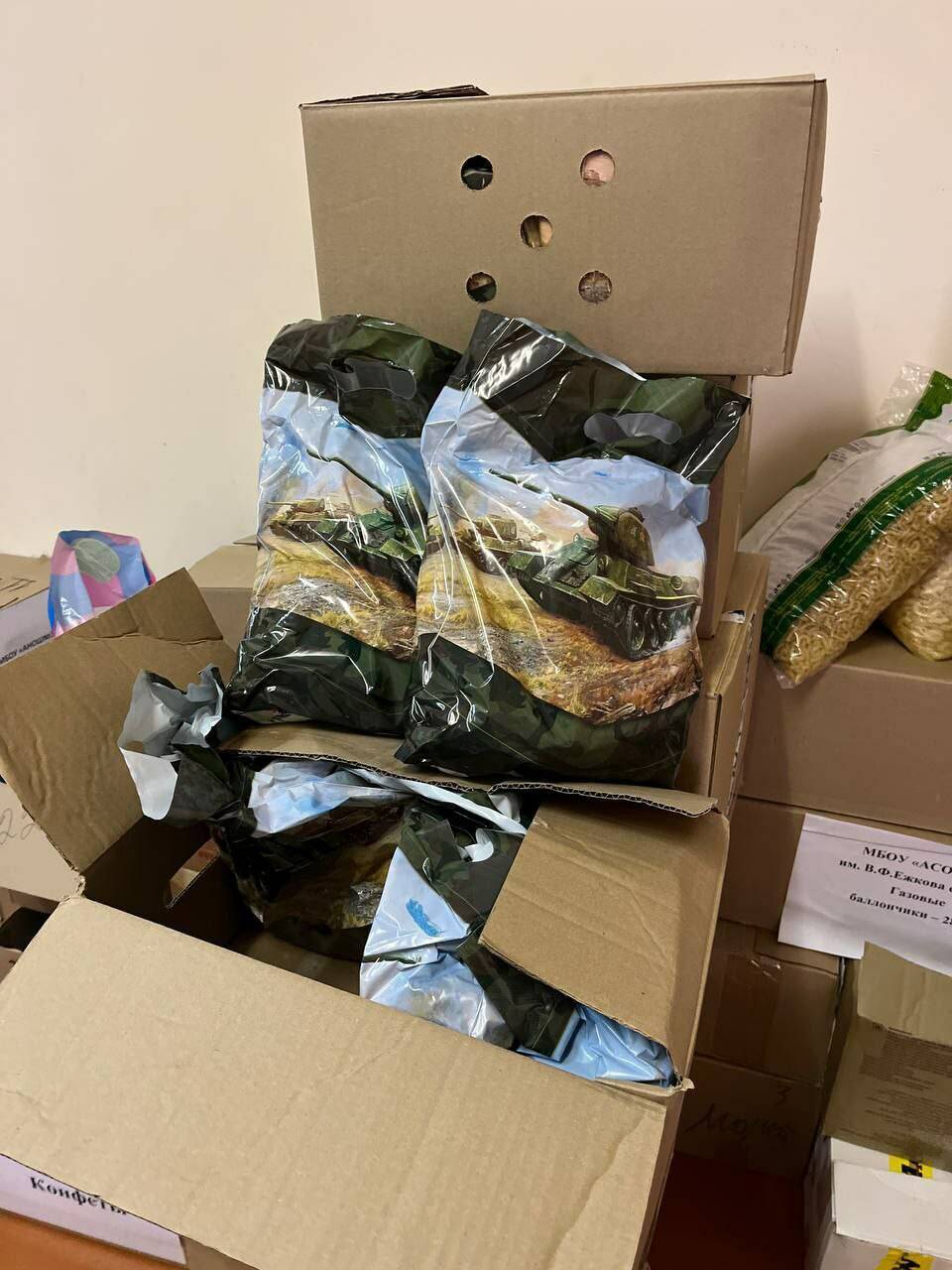 В состав отправки вошли продукты питания, выпечка, лапша, футболки, нижнее белье. Также были переданы 30 противодронных плащей, предназначенных для защиты от воздушной разведки и тепловизоров. Дополнительно по запросу медицинского подразделения закуплены специальные черные мешки.