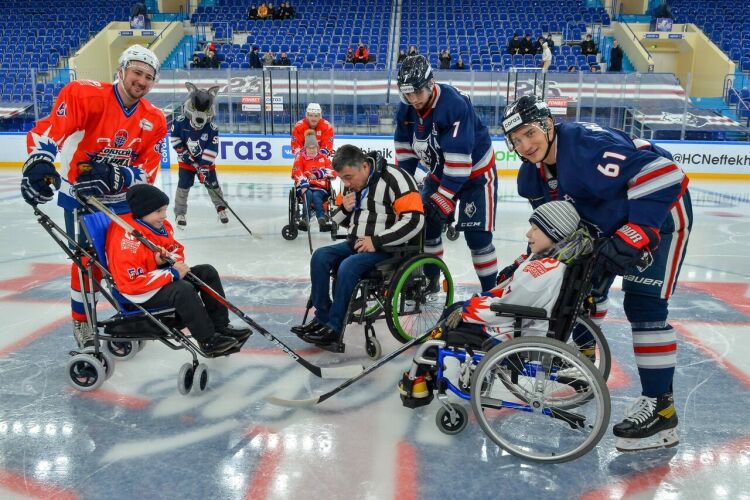 (Казань, 10 апреля, «Татар-информ»). Сегодня в Нижнекамске на льду «Нефтехим Арены» состоялся хоккейный матч, в котором участвовали две команды, составленные из хоккеистов и детей с ограниченными возможностями здоровья.
