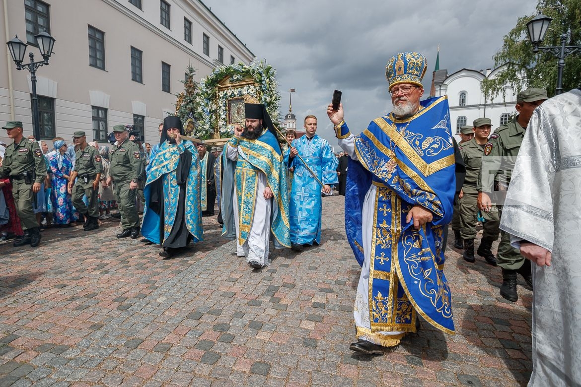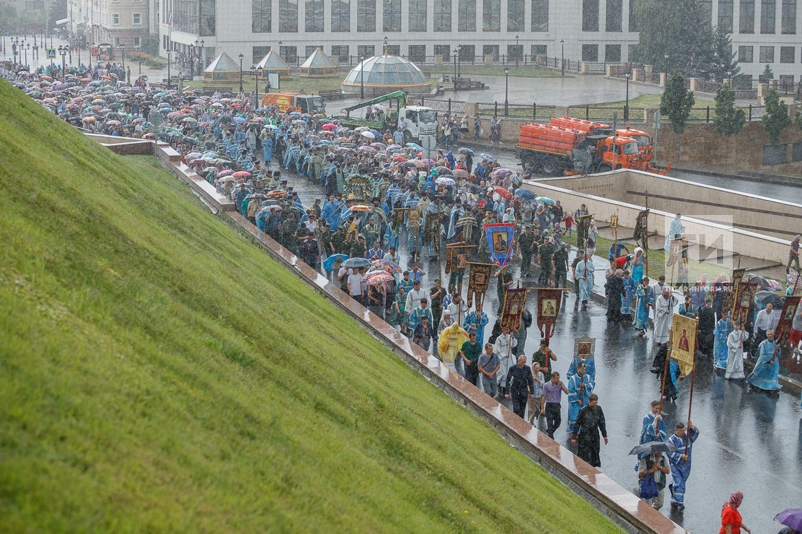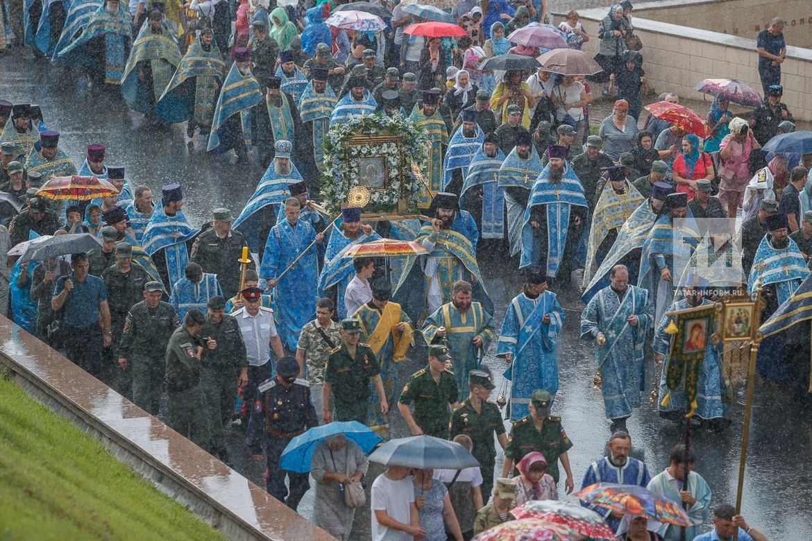 (Казань, 21 июля, «Татар-информ», Елена Кривопатре). В Казани состоялся крестный ход в честь обретения Казанской иконы Божией Матери. Тысячи верующих прошли по центральным улицам города вместе с древним образом Богоматери, несмотря на сильный дождь.
