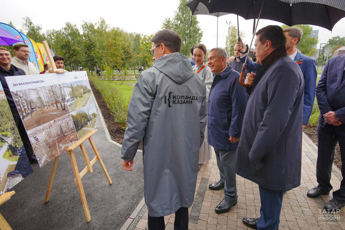 Раис Татарстана Рустам Минниханов и мэр Казани Ильсур Метшин оценили благоустройство дворовой территории в Авиастроительном районе Казани и выступили перед горожанами.