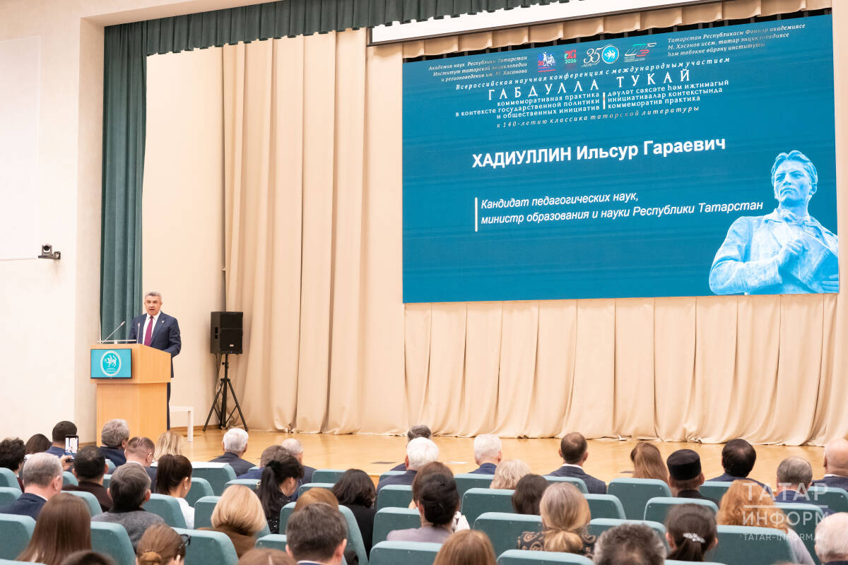 В Академии наук Татарстана состоялась Всероссийская научная конференция «Габдулла Тукай как объект коммеморации: государство и общество», приуроченная к 140-летию со дня рождения классика татарской литературы. Перед участниками выступил министр образования и науки Татарстана Ильсур Хадиуллин.