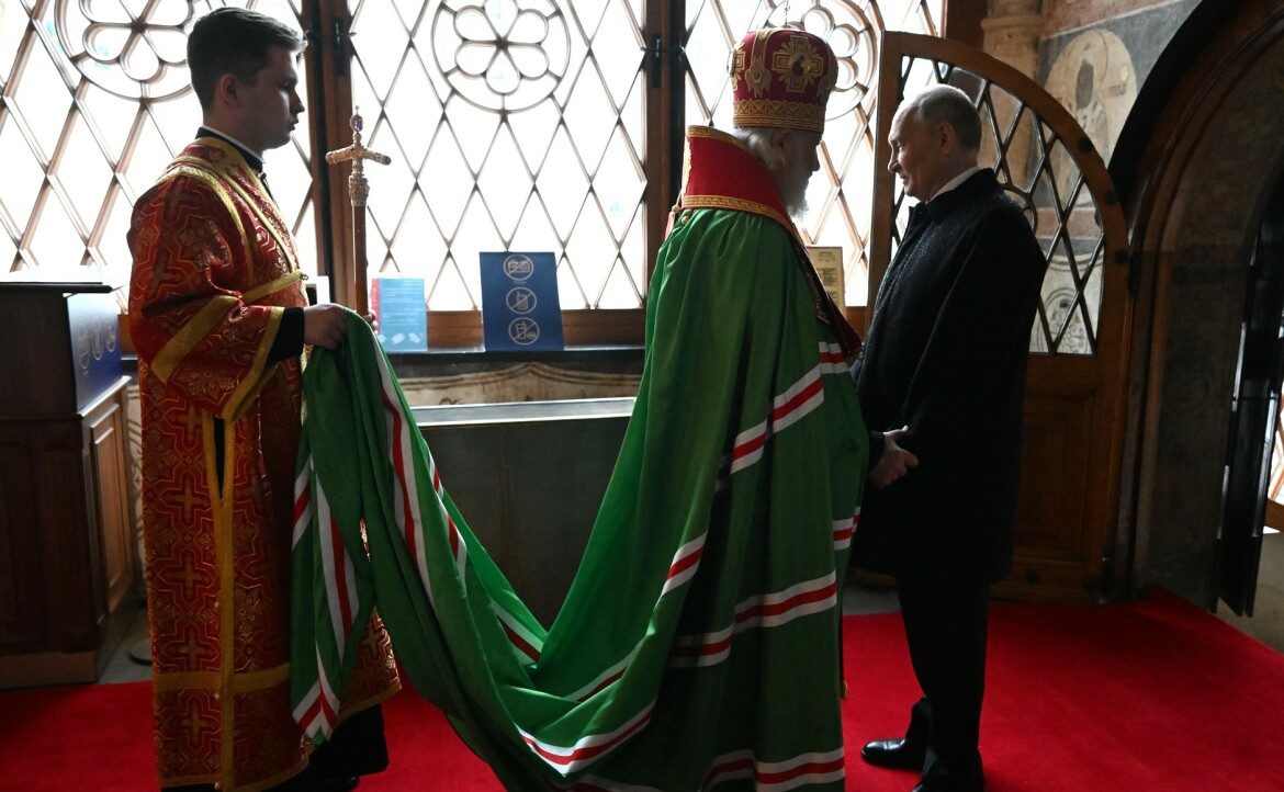 После глава государства отправился в Благовещенский собор, поставил свечку и перекрестился, после чего началось богослужение. Патриарх Московский и всея Руси Кирилл отслужил благодарственный молебен.