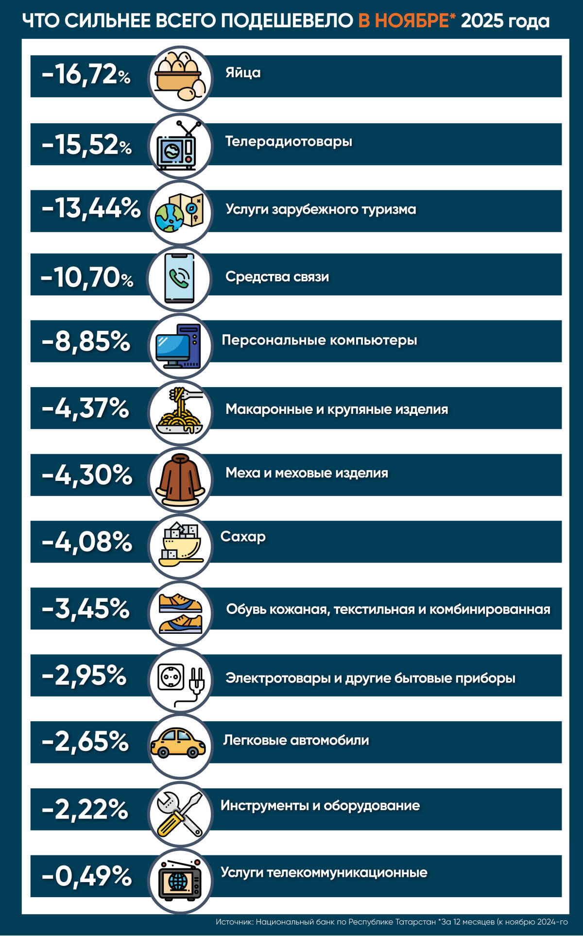 В «непродах» в ноябре подешевели бензин, телевизоры и импортные подержанные автомобили. В первом случае – в том числе благодаря постепенному восстановлению производства после завершения ремонтов на некоторых нефтеперерабатывающих заводах (при этом годовой прирост цен на бензин в ноябре составил 12,92%). Во втором – из-за продолжающегося охлаждения спроса в условиях высоких ставок по кредитам, а также укрепления рубля. В годовом выражении телевизоры в Татарстане стоят дешевле уже на 16,96%, а подержанные иномарки – на 15,42%.